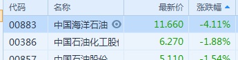 智通财经APP获悉,受国际油价大跌拖累,港股石油股早盘全线下挫,中海油(00883)领跌石油板块。截至9时20分,中海油跌4.11%,报11.66港元,中石化(00386)跌1.88%,报6.27港元,中石油(00857)跌1.54%,报5.11港元。