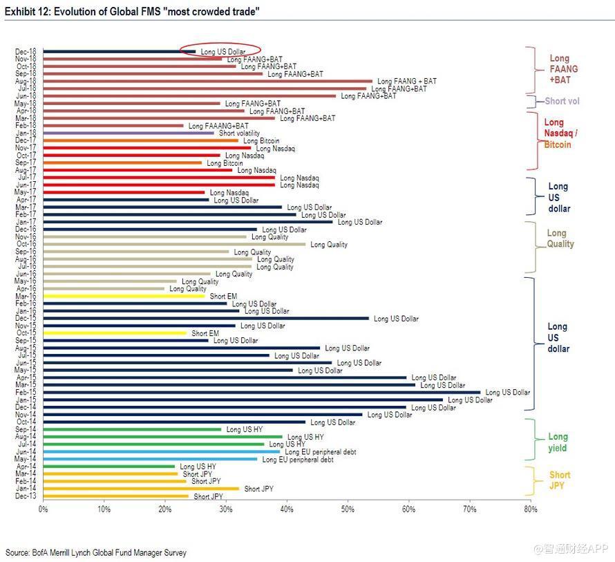 美林美银全球基金经理人调查显示,美元投资在停滞了19个月以后重新被华尔街评为最具价值的投资,做多美元被专业人士视为最受欢迎的交易。