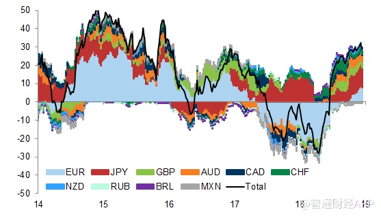 如下图所示,尽管市场对美国经济放缓表示担忧,美元多头头寸仍仅略低于2016年1月以来最高水平。