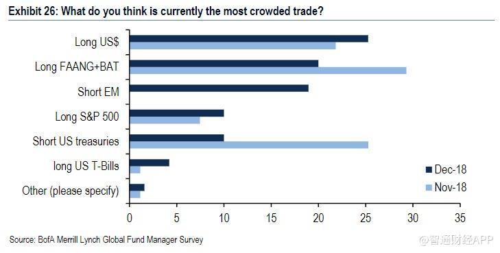 基金经理还未完全放弃社交媒体和科技股,仍有20%的受访者认为做多社交媒体和科技板块是最拥挤的交易,仅次于25%的受访者认为做多美元是最拥挤的交易。有19%的受访者则认为是做空新兴市场。