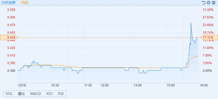 智通财经APP获悉,熊猫绿能(00686)尾盘股价直线拉升,本月内累计涨幅超五成,截至15时53分,涨17.11%,报价0.445港元,成交额2060.69万。
