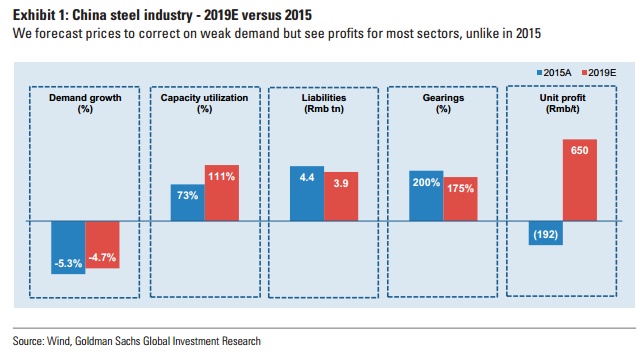 在经历了3年的供给侧改革之后,高盛认为明年中国原材料板块将会充满挑战,首先是需求端几乎全面走弱,供需平衡随之恶化,那么原材料的价格和公司的利润将会低于2018年,但是会远好于2015年。