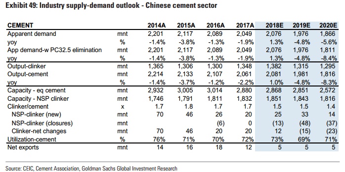 高盛认为未来两年水泥行业的需求会下降的比较快,分别下降4.8%和5.6%,主要是因为PPP项目的减少,尤其是东北、中南、西北等地区。供给方面,由于协同限产、环保问题、消除32.5标号水泥等事件在2019年仍会继续,预计未来2年熟料产能也会继续下降。