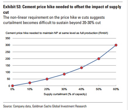 水泥目前的高价主要是行业协同限产支撑住的,并非产能的永久关闭,这是目前比较大的一个风险点。限产会导致每单位水泥分摊的固定成本、三费增加,推高水泥成本。根据高盛的测算,如果减产20%,水泥价格需要增加50元/吨;如果减产30%;价格需要上涨100元/吨;如果减产50%,价格需要上涨200元/吨,才能抵消成本的增加。