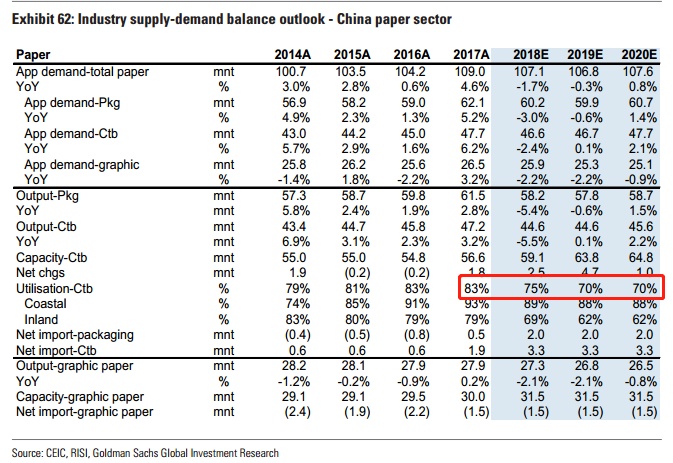 需求方面,包装用纸总量的下降、电子阅读的增涨,需求将会走弱。供给方面,高盛认为在2018-2020年三年内,将会增加20%-22%的产能。