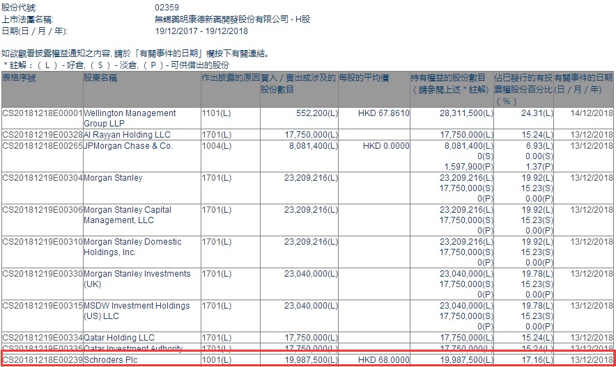 智通财经APP获悉,根据联交所资料显示,施罗德于12月13日增持药明康德(02359)1998万股,每股作价68港元,总值约13.5864亿港元,最新持股数目1998万股。