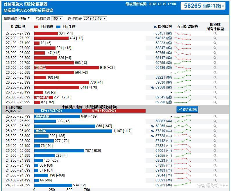 智通财经APP获悉,截至12月19日,恒指最新的牛熊街货比例43:57。从瑞信恒指牛熊证街货分布图中得到的数据显示,熊证街货重货区在26600-26699区间,该区间熊证数量为919张,比上一交易日增加23张;最多新增在26000-26099区间,新增261张。牛证中重货区在25400-25499区间,该区间最新牛证数量为1107张,比上一交易日减少117张;最多新增在25700-25799区间,新增189张。