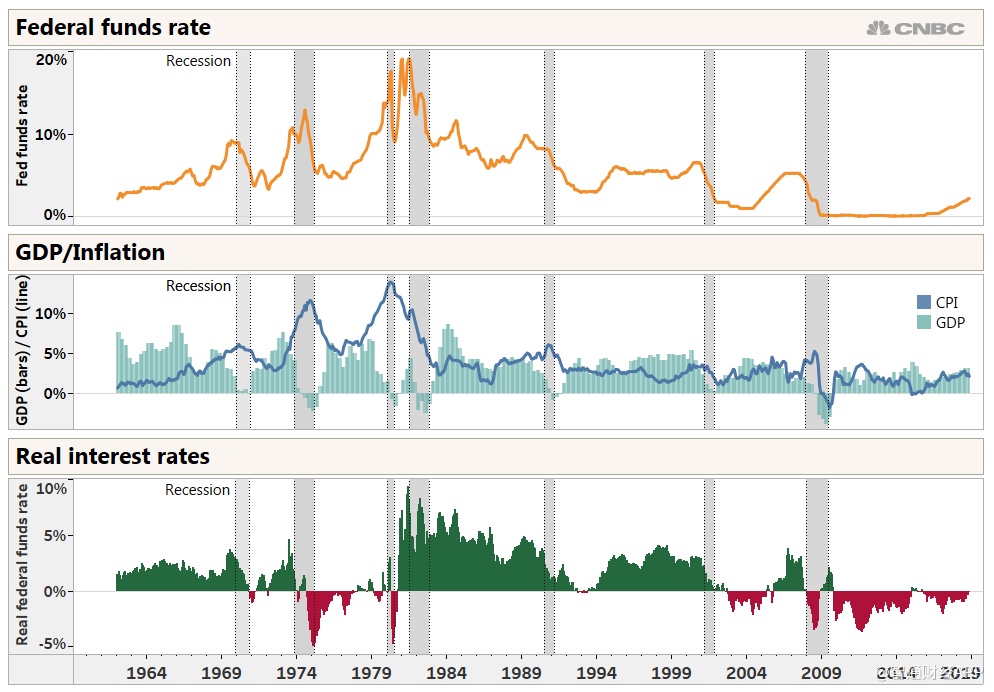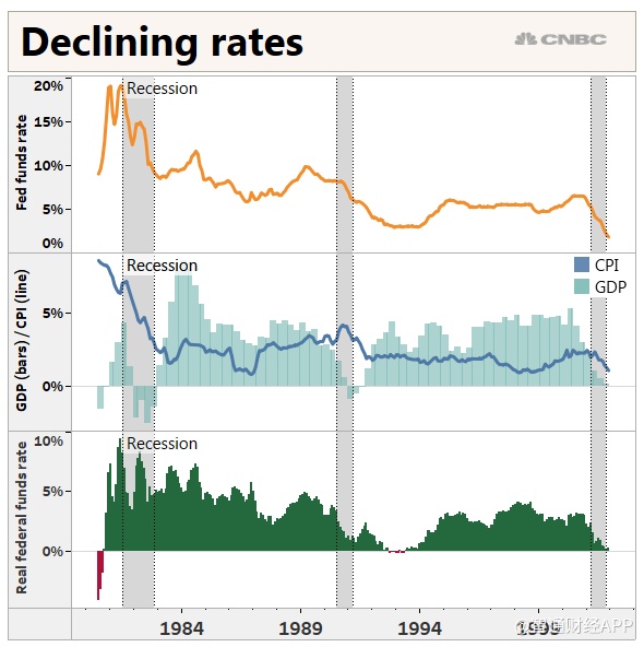 在20世纪80年代和90年代的大部分时间里,在美联储采取历史性措施以两位数的利率抑制20世纪70年代的通货膨胀之后,美国经济和股票市场一直享受着利率逐渐下降的长尾风。但美国GDP和股价并非没有遭遇挫折,这包括上世纪90年代初的短暂衰退和1990年代末的亚洲金融危机等。但长期利率下降的趋势为美联储提供了大量降息空间,以阻止经济或金融衰退。