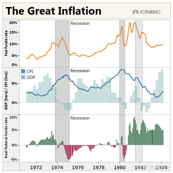 在实行两位数的利率之前,在上世纪70年代的大部分时间里,美国经历了一场毁灭性的通胀。从1973年开始,美国政府既面临通胀上升,又面临经济萎缩,这种情况被称为滞胀。即使在实际利率低于0的情况下,高通胀率仍在继续侵蚀消费者的消费能力和金融资产的价值。