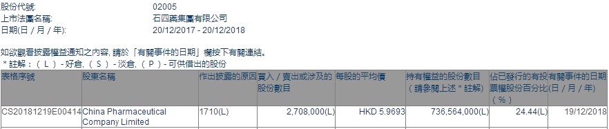 智通财经APP获悉,根据联交所资料显示,China Pharmaceutical Company Ltd于12月19日增持石四药集团(02005)270万股,每股作价5.9693港元,总值约1611.7万港元,最新持股数目约7.36亿股。