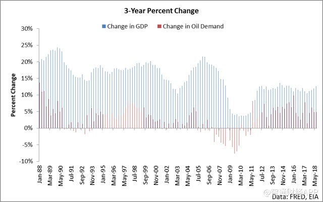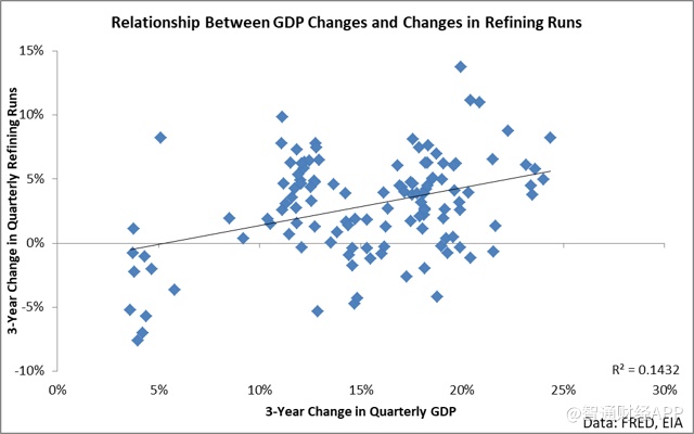 不过,以上分析没有将美国整体经济作为原油需求的决定因素来考量。坦率来讲,两者之间的联系是不可否认的。从以下数据可以看出,美国GDP的变化与原油需求的变化之间存在着直接(但不完全)的相关性。