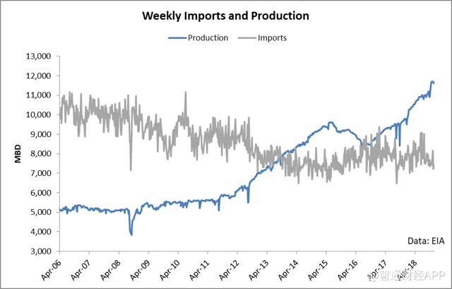 过去几年,美国逐渐变得更依赖国内原油生产,对进口的依赖则逐渐减少。如下图所示,其原油产量在过去12年里翻了一番,而进口则下降了近20%。
