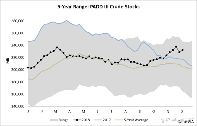 当最终经济衰退到来时,原油需求将放缓,但原油供应将像过去8年一样一如既往地增加。产量的持续增长,加上需求的减缓,无疑会因供过于求导致油价下跌。这种下跌可能会导致美油和布油出口的进一步增加,届时,油价会保持在较低水平。值得注意的是美国的PADD 3区,美国几乎所有的原油出口都来自该区域,剩下部分再由PADD 5区补充一些散货。就当前水平来看,PADD 3存量正在持续增长,远高于5年年均的当期水平。