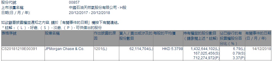 智通财经APP获悉,根据联交所资料显示,摩根大通于12月14日减持中国石油股份(00857)6211万股,每股作价5.3798港元,总值约3.3414亿港元,最新持股数目约14.32亿股。