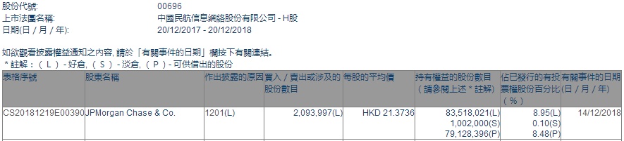 智通财经APP获悉,根据联交所资料显示,摩根大通于12月14日减持中国民航信息网络(00696)209万股,每股作价21.3736港元,总值约4467.1万港元,最新持股数目8351万股。