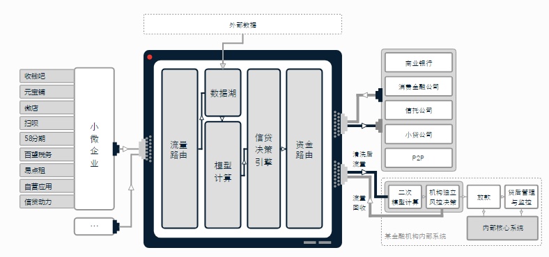 以信贷解决方案为例,解决方案包括:流量路由、数据处理、风控、信用定价、资金路由、金融机构独立信贷评估、客户运营、还款管理、贷后管理九个模块。每个模块可成独立产品,亦可成整套方案。