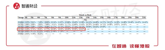 并且,数据还显示,在按季度统计的Vintage M3+逾期率上,嘉银金科促成的贷款一般不低于14.43%。其中,2017年Q3发放贷款的逾期率更是高达20.62%。