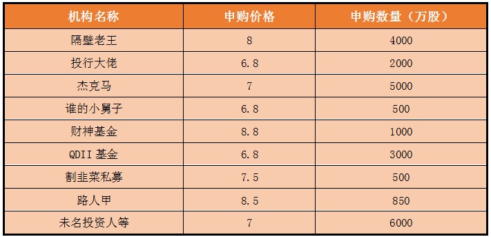 BB太多了,回到正题。国际配售的投资者根据自己的分析及风险偏好,报出自己能接受的最高价,如果最终定价高于机构报出的价格,就不要了。举个栗子,有助于理解。在6.8~8.8元的询价区间内,各投资者报出的价格与数量: