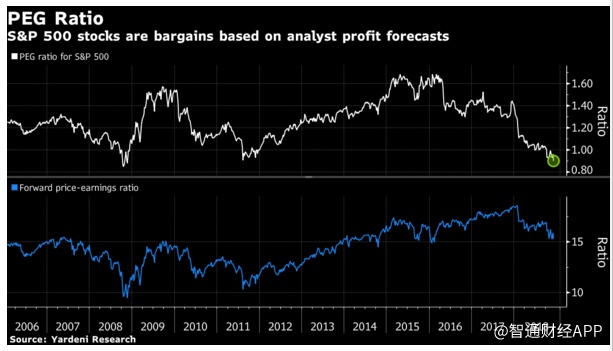 Ratio)来衡量当前标普500指数,会使美股看起来特别便宜。因为这是该指标至1995年以来第三次跌至1以下。如果投资者对市场信心增强,PEG比率将回升至1,意味着标普500指数会上涨11%。若回到历史平均水平1.3,则意味着标普500指数会上涨44%。