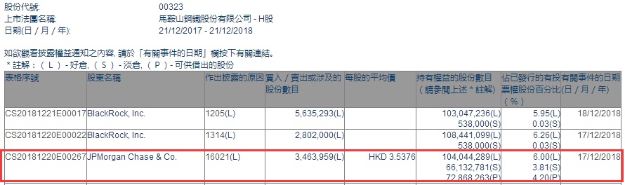 智通财经APP获悉,根据联交所资料显示,摩根大通于12月17日增持马钢(00323)346万股,每股作价3.5376港元,总值约1224万港元,最新持股数目约1.04亿股。