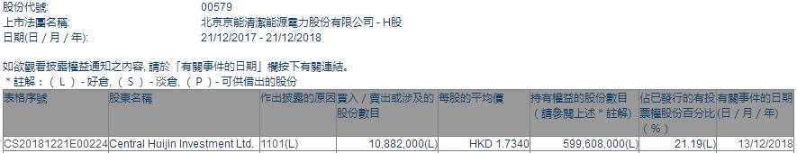 智通财经APP获悉,根据联交所资料显示,Central Huijin Investment Ltd于12月13日增持京能清洁能源(00579)1088万股,每股作价1.734港元,总值约1886.59万港元,最新持股数目约5.99亿股。