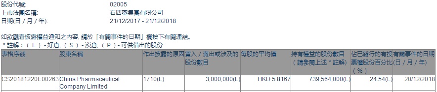 智通财经APP获悉,根据联交所资料显示,China Pharmaceutical Company Ltd于12月20日增持石四药集团(02005)300万股,每股作价5.8167港元,总值约1745.01万港元,最新持股数目约7.39亿股。