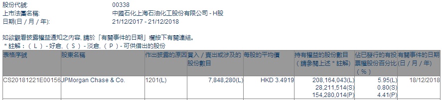智通财经APP获悉,根据联交所资料显示,摩根大通于12月18日减持上海石油化工股份(00338)784万股,每股作价3.4919港元,总值约2737.65万港元,最新持股数目约2.08亿股。