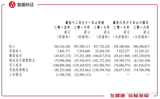 利润率波动主要是因为收入增长虽快,可是成本增长更快。过去三年,融资成本从0.46亿增至1.67亿,年复合增长达到90.4%,2018年首6个月融资成本1.85亿港元,占收入比33%,同比增长180%。