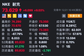 智通财经APP获悉,耐克(NKE.US)财报超预期,周五开盘股价大涨近9%,截至发稿,涨逾9%,报73.629美元。