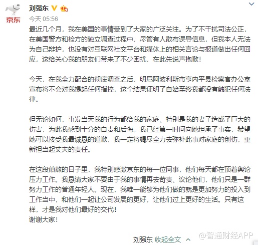 早间刘强东也在微博发表致歉声明,称给家庭和妻子造成巨大伤害,此后将更努力投入到工作当中。