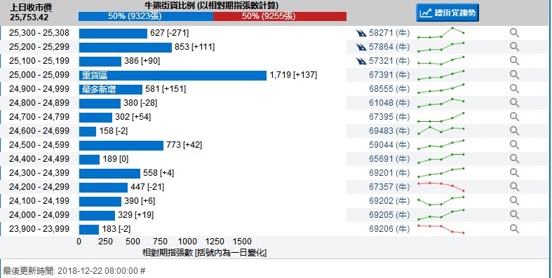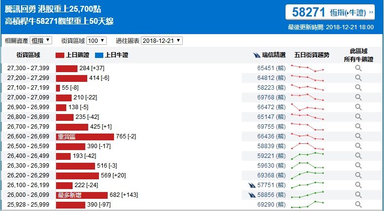 智通财经APP获悉,截至12月21日,恒指最新的牛熊街货比例50:50。从瑞信恒指牛熊证街货分布图中得到的数据显示,熊证街货重货区在26600-26699区间,该区间熊证数量为765张,比上一交易日减少2张;最多新增在26000-26099区间,新增143张。牛证街货重货区在25000-25099区间,该区间最新牛证数量为1719张,比上一交易日增加137张;最多新增在24900-24999区间,新增151张。