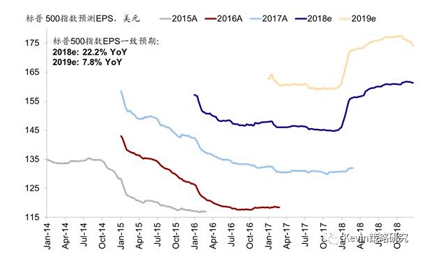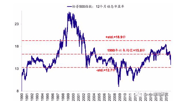 实际上,单纯静态来看,当前美股市场估值水平计入的增长预期已经较为悲观。当前美股标普500指数13.9倍的12个月动态估值已经低于长期15.8倍的历史均值10%以上,这一幅度基本隐含了2019年美股盈利负增长的悲观情形,而当前市场一致预期对于2019年标普500指数EPS同比增速预期为7.8%左右。