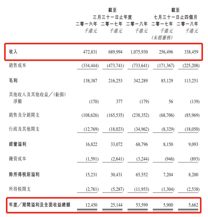 智通财经APP观察到,2016-2018财年,公司收入从4.7亿港元增至10.8亿港元,复合增长率达50.8%。与此同时,公司净利润从1245万港元,增至5359.9万港元,复合增长率高达107.5%。