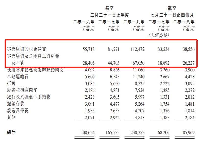 其中最让公司“头疼”的莫过于高昂的店铺租金及人工成本。财务数据中可以看到,店铺租金及员工薪资一直占据公司销售费用的较大比重。2018财年,这两项费用支出占公司当期总销售费用的75.3%。并且近三个财务年度的租金开支年均复合增长率达到42.1%,员工的薪金年均复合增长率达到53.6%。