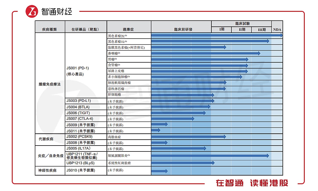 而肿瘤免疫疗法剩下的6个在研药品,均未披露适应症,基于PD-L1靶点的JS003处于临床Ⅰ期,其余仍处于临床前的研发阶段。