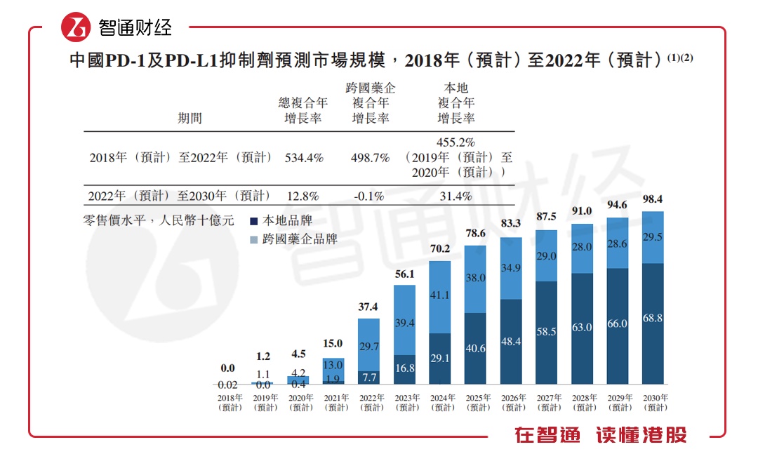 从市场需求看,基于PD-1/PD-L1的肿瘤免疫疗法(此处以最易商业化的核心药品为讨论对象)在国内仍处于起步阶段,据弗若斯特沙利文数据显示,2018年,中国PD-1/PD-L1抑制剂的市场规模不足1亿元人民币,但至2020年时,将增长至45亿元,2022年进一步扩大至374亿元,年复合增长率534.4%,行业爆发式增长。