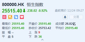 智通财经APP获悉,恒生指数开盘跌238.02点或0.92%,报25515.4点。国企指数跌1.1%,报9990.09点。红筹指数跌0.91%,报4086.09点。大市盘前成交26.82亿港元。因圣诞节假期,港股通北向关闭,港股今日仅上午开市,下午休市。12月25日(星期二)及26日(星期三)则全天休市,之后恢复正常。