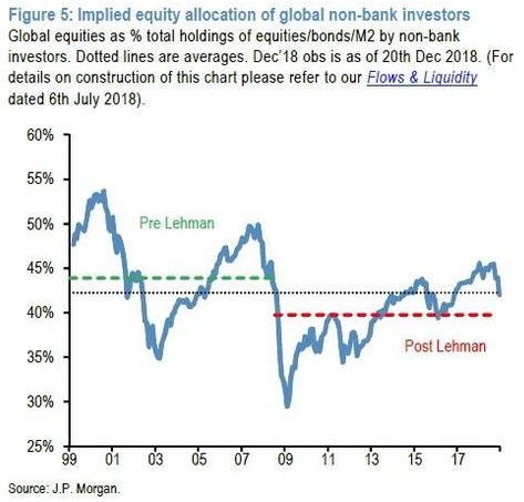 过去三个月股价的下跌使全球股指较1月份峰值下降了20%,这令全球非银行投资者不再增持股票,下图显示投资债券和股票的非银行投资者对股票的配置,接近1999年以来的历史平均水平。