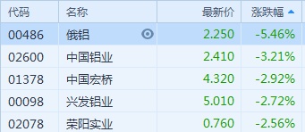 智通财经APP获悉,铝业股集体走弱,截至11时1分,俄铝(00486)跌5.46%,报价2.25港元,中国铝业(02600)跌3.21%,中国宏桥(01378)及兴发铝业(00098)跌超2%。