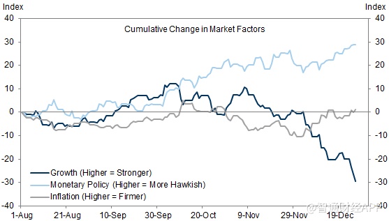 2,市场普遍持悲观态度。高盛的全球当前活动指标(Global Current Activities Indicator)从年初的5%降至3.4%。另外,美国金融状况指数(Financial Condition Index)的急剧收紧可能会对明年的经济增长造成压力。自10月初以来,美国金融状况指数收紧超过100个基点,如果持续下去,明年美国经济增速可能减少1个百分点。