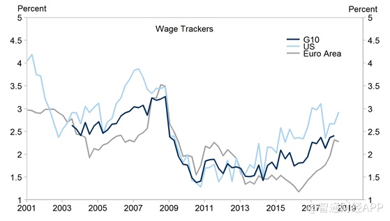 6,发达经济体的通胀率将保持稳定,实际工资将持续上涨。美国核心通货膨胀率从2%下降至1.9%,欧元区核心通货膨胀率仍停留在1%。能源价格急剧下降,发达经济体的工资增长显著回升。高盛的分析表明,我们应把发达经济体内工资的上涨看作是对物价通胀数据的检验,从而确认通货膨率接近目标水平。高盛还发现,欧洲范围内的工资增长通常导致物价上涨,这表明欧洲核心通胀率将在一段时间后有所上升。