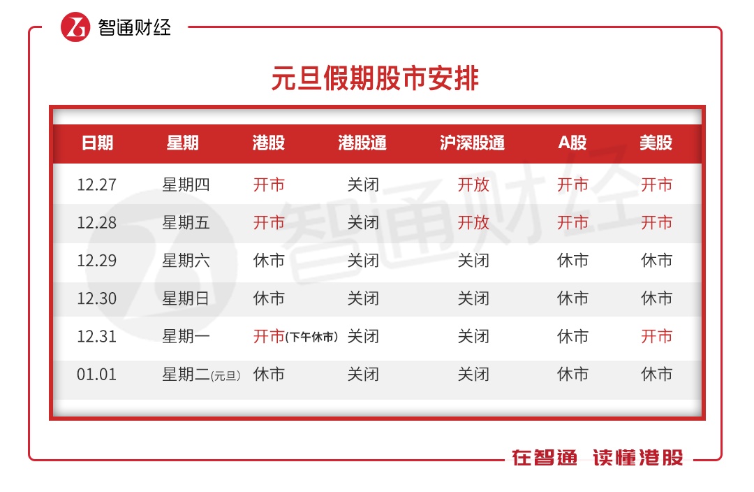 智通财经APP获悉,元旦即将来临,12月31日(星期一)港股上午开市,下午休市,A股全天休市,美股正常开市。节日当天(1月1日),港股、A股、美股均休市。