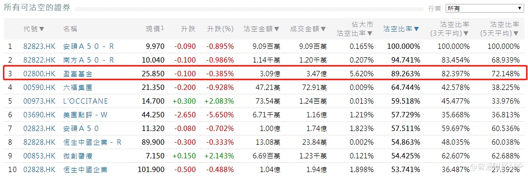我们当然希望股市的未来是向好的,有钱大家一起赚。但上周五(12月21日),盈富基金(02800)沽空比率高70.85%,本周一(12月24日)更是达到89.26%,却不得不让引起我们的注意。