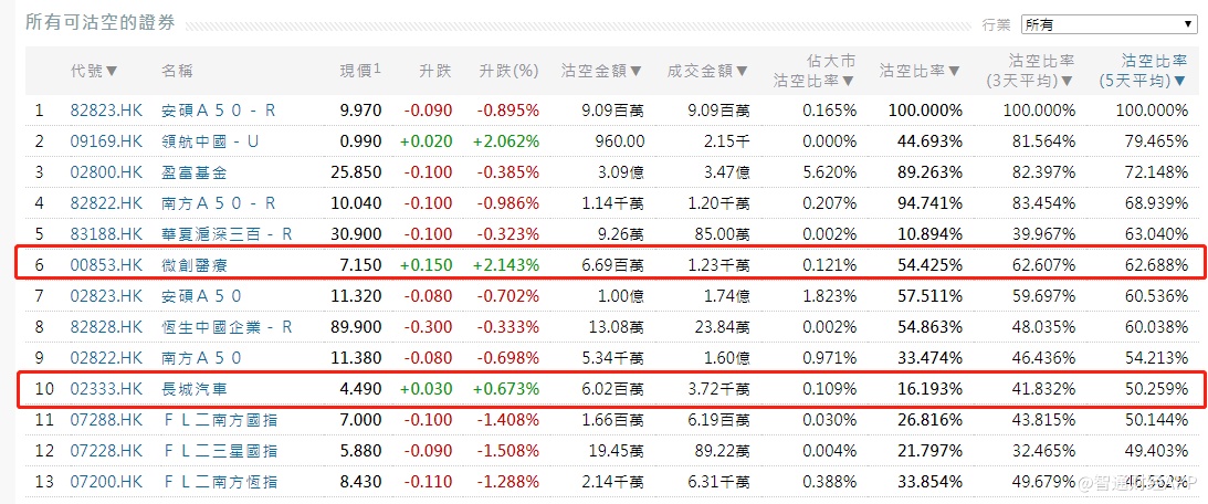 据智通财经APP获悉,过去5个交易日,平均沽空比率超过40%的个股有微创医疗(00853)和长城汽车(02333),分别达62.688%和50.259%。