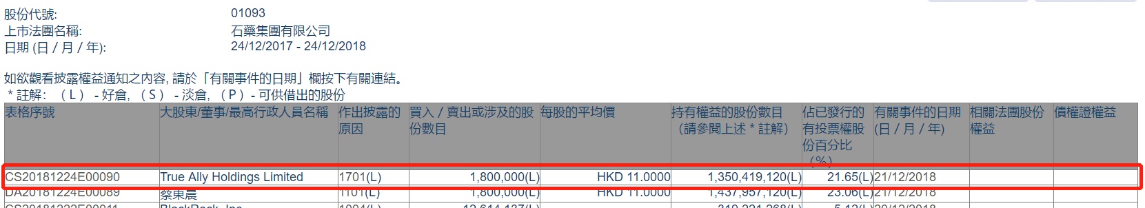智通财经APP获悉,联交所股权变动资料显示, 石药集团(01093)于12月21日获True Ally Holdings Ltd增持180万股,每股作价11港元,总值1980万港元,最新持股数目约13.5亿股。