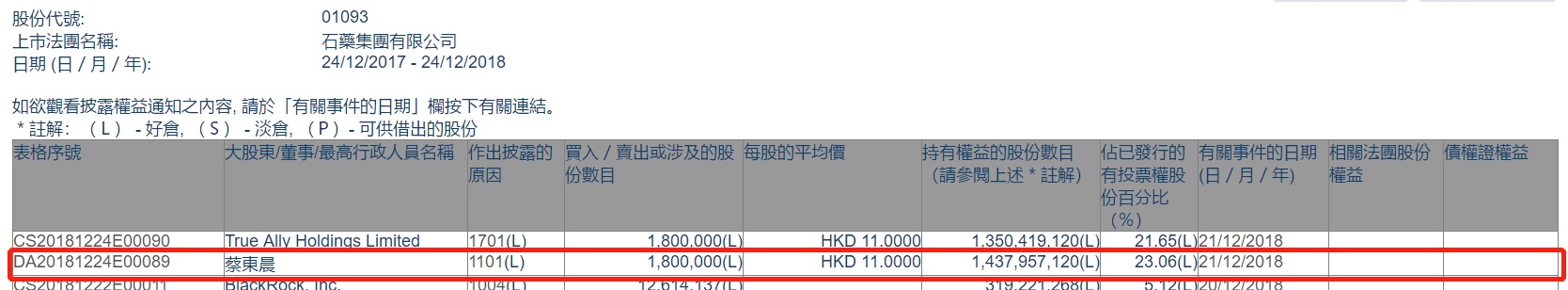 智通财经APP获悉,联交所股权变动资料显示,石药集团(01093)于12月21日获蔡东晨增持180万股,每股作价11港元,总值1980万港元,最新持股数目约14.3亿股。