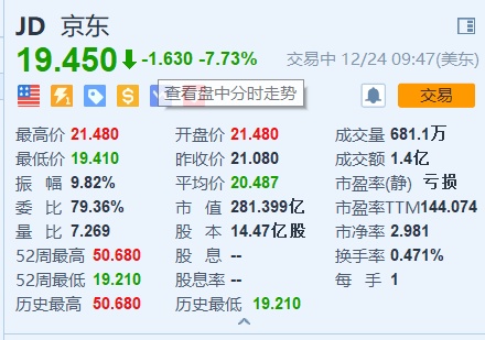 智通财经APP获悉,周一开盘京东(JD.US)股价大幅向下,截至发稿,跌近8%,报19.45美元。而盘前京东股价一度涨超6%。