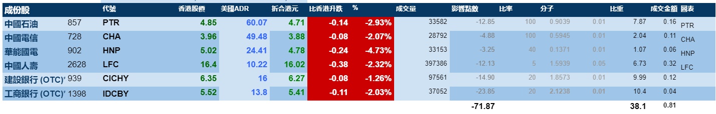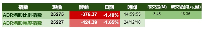 智通财经APP获悉,美股周一大幅下挫,创史上最差圣诞节前夜表现,拖累港股ADR指数受压,按比例计算,收报25275点,跌376点或1.49%。