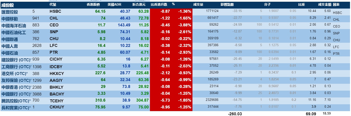大型蓝筹全日下跌,汇丰控股收报63.28元,较港收市跌0.9元;腾讯控股收报304.87元,较港收市跌5.73元。