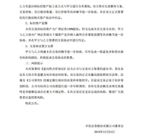 广州证券业绩下滑,且资产质量存在较大的风险,中信证券收购这样的资产本身就会承担比较大的业绩压力,但更重要的是收购价格,由于公告中,双方目前达成的是意向性收购,所以交易价格等内容可能要在几个交易日之后才公布。